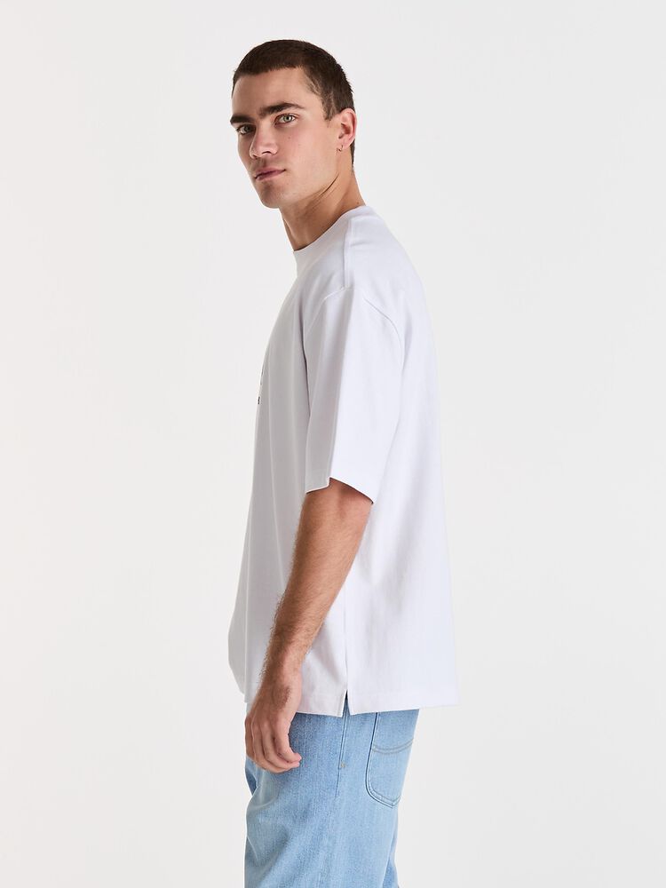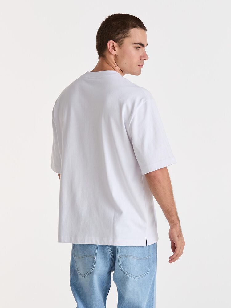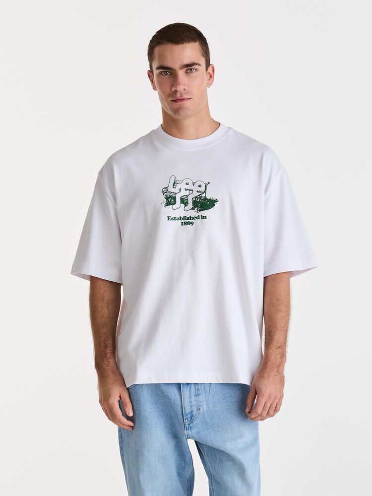 The Mate Boxcut Tee is a boxy, cropped baggy fit tee. Crafted in a heavy weight, recycled cotton jersey with a soft hand feel. Featuring a hand drawn Lee Logo, transferred in a screen print for an authentic vintage look.