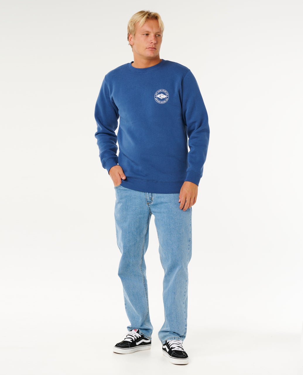 The Stapler Crew delivers classic surf vibes with a standard fit and cotton-poly fleece. Features include front and back prints, inner neck details, and woven label for a clean, casual look.