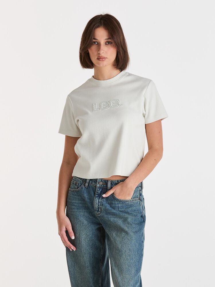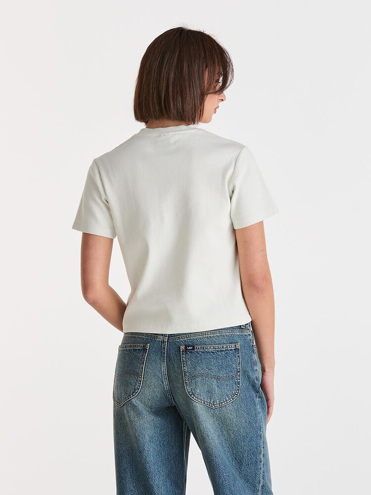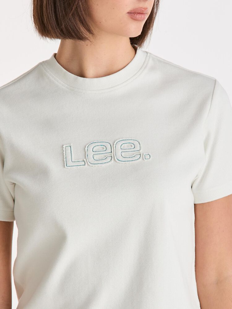 The Undone Shrunken Rib Tee is the newest addition to our tee fits. Crafted in a recycled cotton ribbed fabric. Featuring an applique Lee chest logo, sewn in a tonal overdye with contrast stitching.