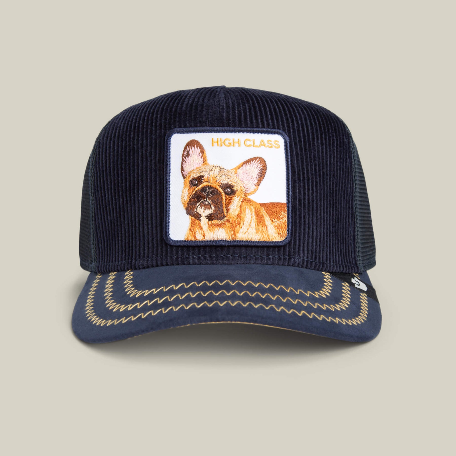 High Class Remix rolls deep in navy-on-navy textures with golden stitching so rich it should come with a tax bracket. The Frenchie patch brings just the right amount of “you can’t sit with us” energy—equal parts sass, status, and subtle shade.