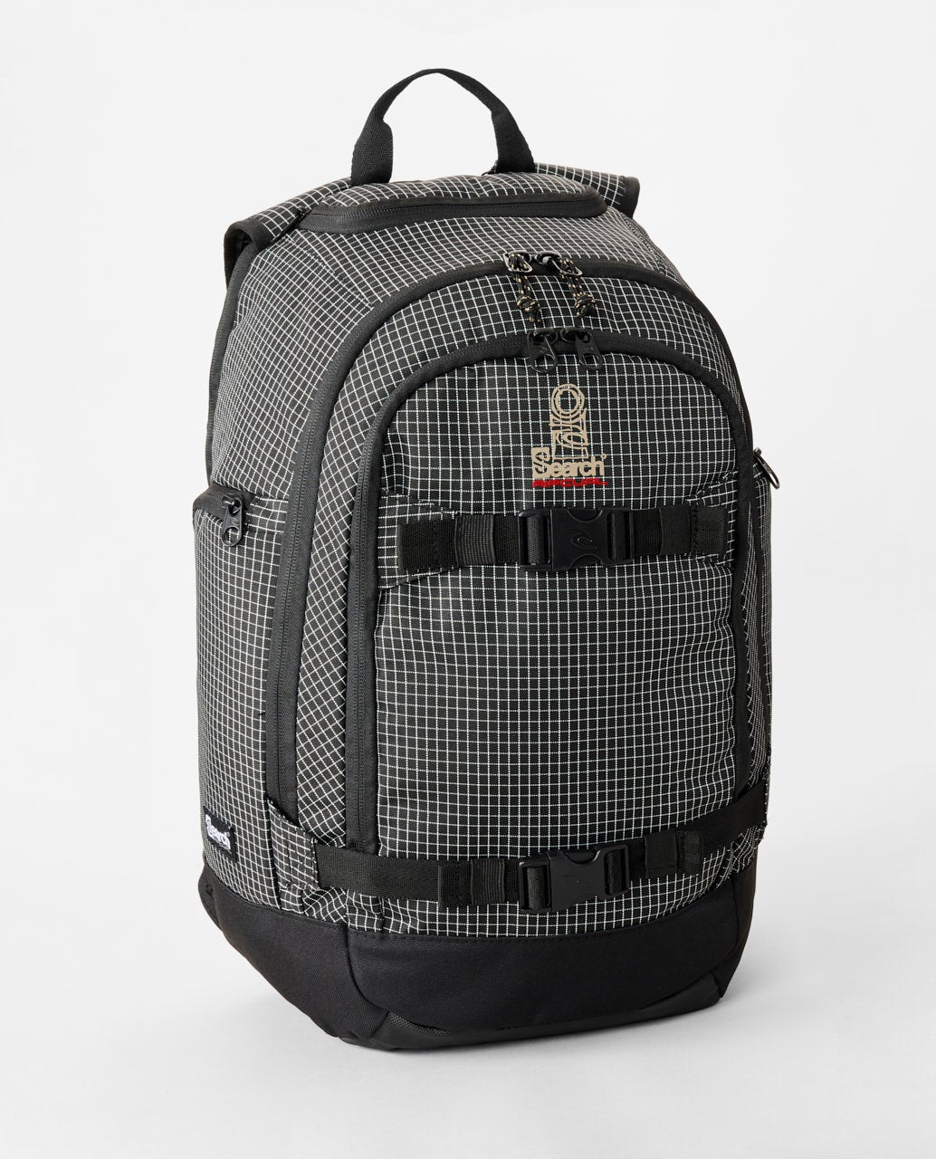Posse Ripstop 33L Backpack blends recycled polyester with Hydro Protech finish. With 33L capacity, laptop section, fleece-lined sunglass pocket, insulated bottle pocket, multiple organizer compartments, skate straps, airmesh back panel, and breathable straps, it’s a versatile pack built for surf, skate, and travel needs.