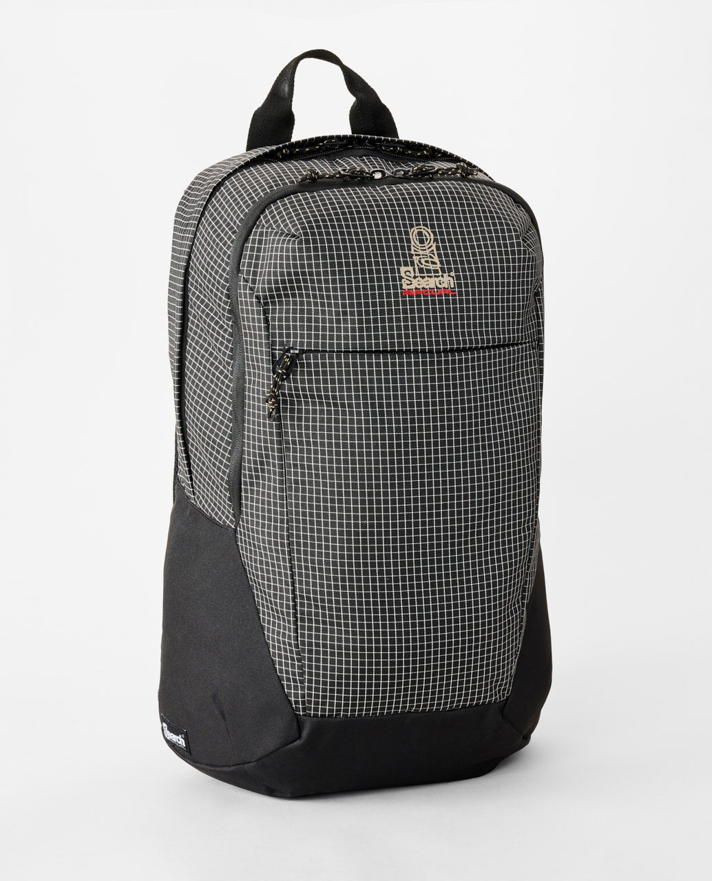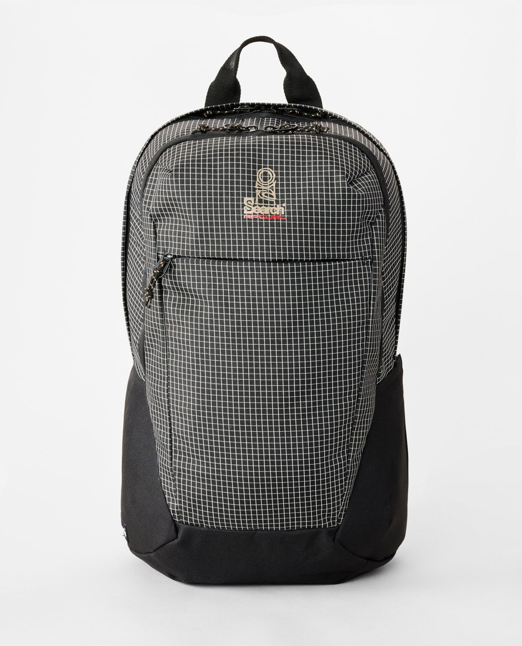 Overtime Ripstop 30L Backpack is crafted from recycled polyester with Hydro Protech coating. With 30L capacity, large audio pocket, drink bottle pocket, fleece-lined front compartment, and breathable airmesh straps, it delivers surf-ready organization and lightweight convenience for daily or coastal adventures.